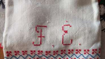 An embroidered cloth with my cousin Evike “Eva” Fisch’s initials, F.E. Her embroidery is the only object that remains from her short life.