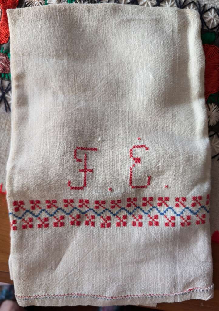 Description: An embroidered cloth with my cousin, Evike “Eva” Fisch’s initials, F.E. In Hungary, the surname comes first. Eva was a very hard-working girl and would often run the office of her parents’ construction material plant. She was imprisoned in Bergen-Belsen concentration camp in 1944 and died of typhoid fever shortly after the camp was liberated on April 15th, 1945. She was only sixteen years old. Her embroidery is the only object that remains from her short life.